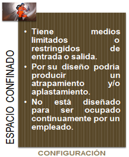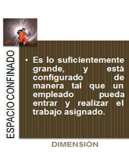 DEFINICIÓN: Un espacio confinado se define como un espacio lo suficientemente grande y configurado de manera que una persona puede entrar y realizar un trabajo, con medios de entrada y salida limitado y no está destinado para ocupación humana continua.